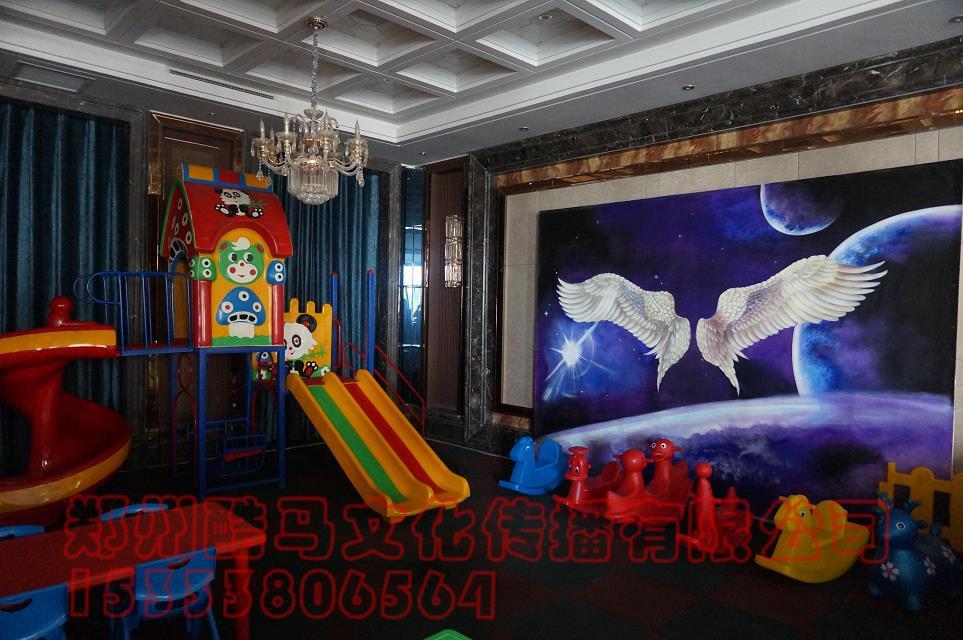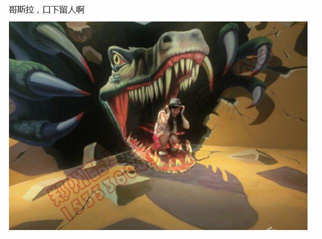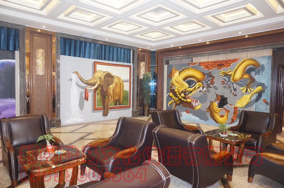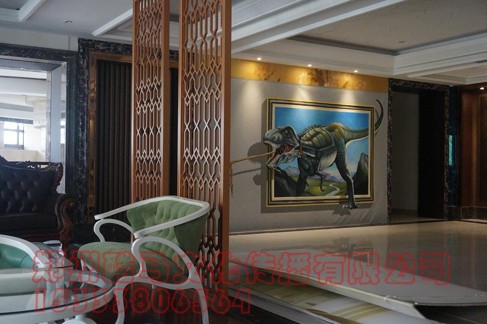 3D画在售楼部各个位置的效果,儿童娱乐区的天使的翅膀、沙盘区的洒水大象和破墙祥龙以及休闲区的可爱幼龙和待牵的霸王龙