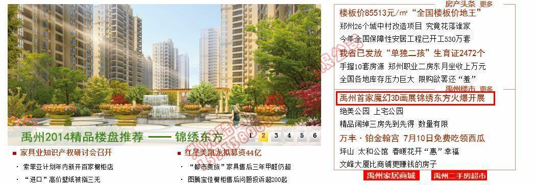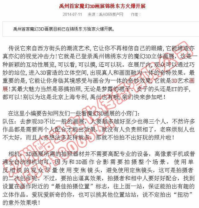 7月11日,房产网出现以“禹州首家魔幻3D画展锦绣东方火爆开展”为标题的宣传。想以这样的“噱头”来招揽人气,3D画会事半功倍!