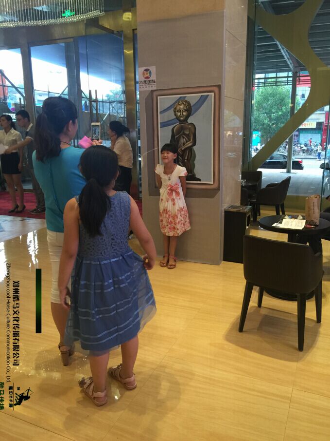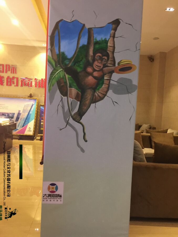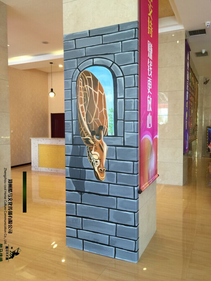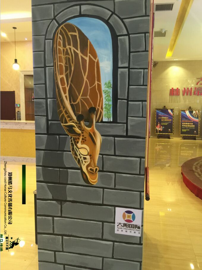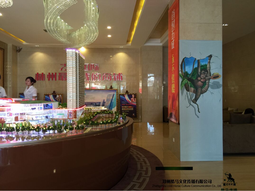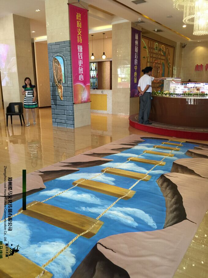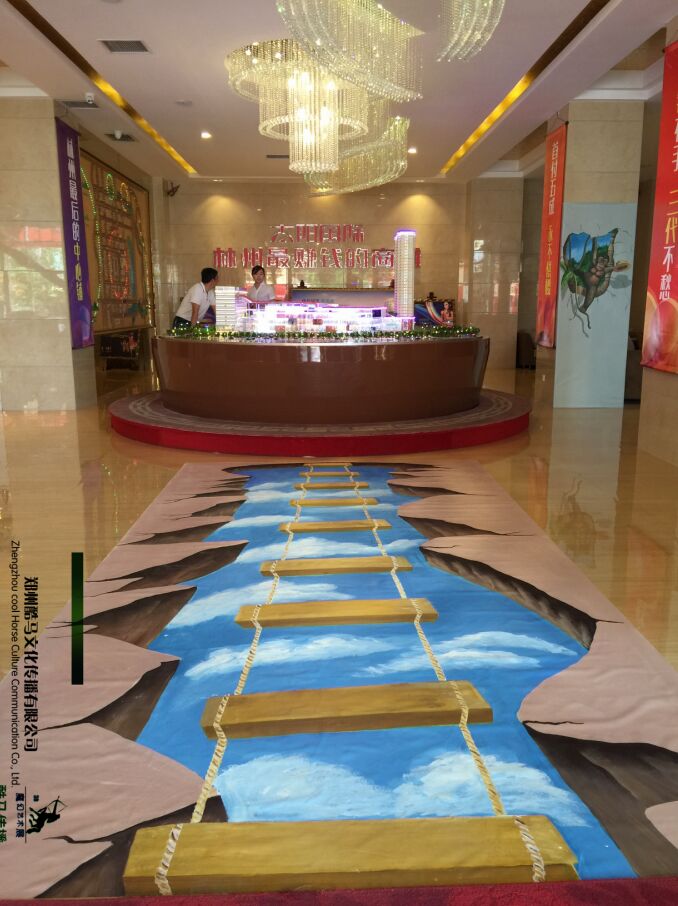 安阳太阳国际项目位于安阳市林州,本次售楼部3D画包装作品全部由手绘制作。进门一幅“天梯”3D地画设计,给客户以震撼的